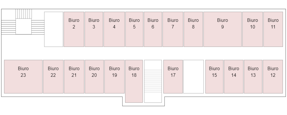 21 biur przeznaczonych do wynajmu mieści się na III piętrze o powierzchni ok. 480 m2.